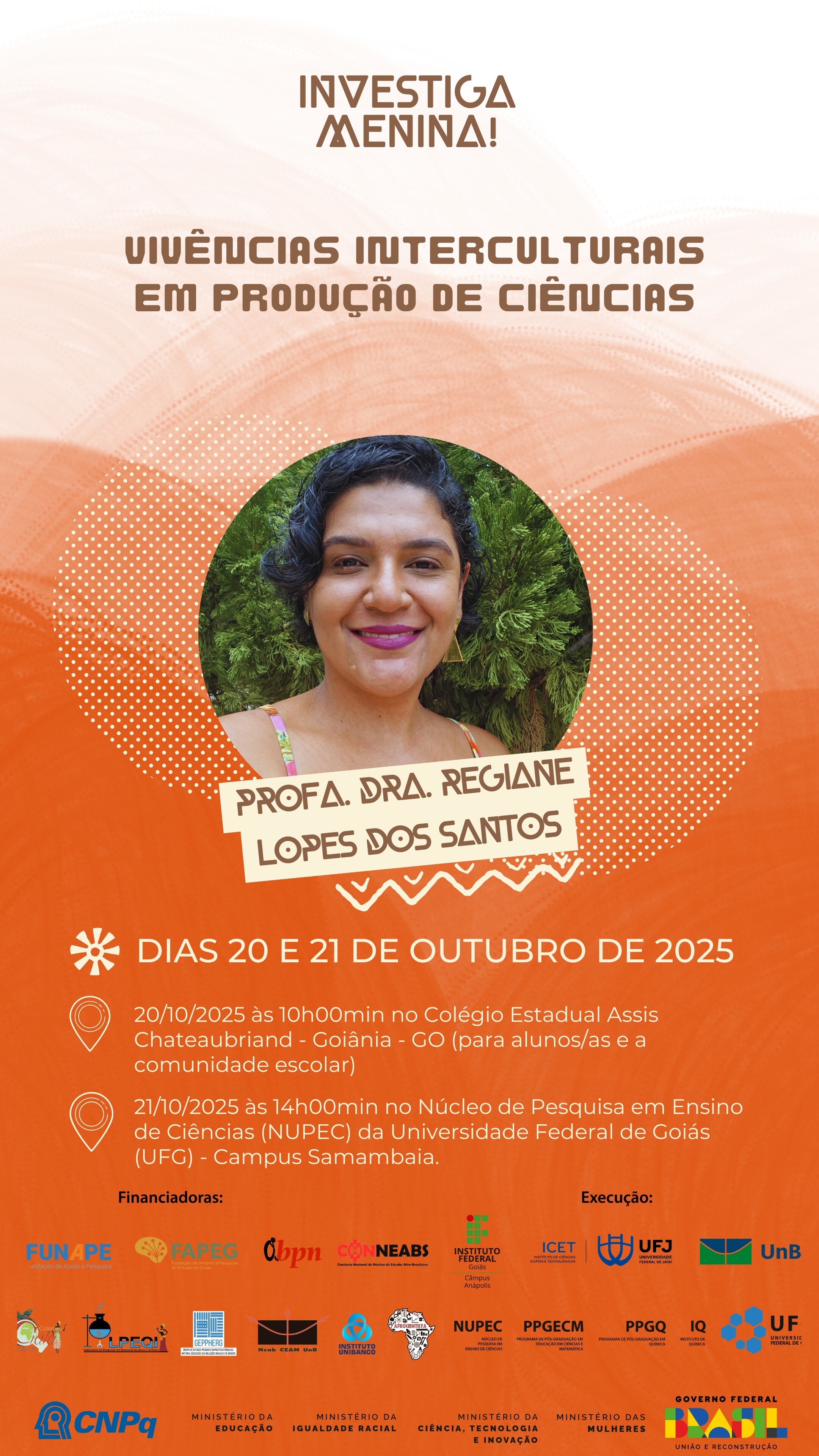 👩🏽🔬Vem aí, a 5ª Vivência Intercultural em Produção de Ciências do Investiga Menina de 2025, por meio do Edital do Conselho Nacional de Desenvolvimento Científico e Tecnológico - CNPq/ Ministério da Ciência, Tecnologia e Inovação - MCTI e o Ministério das Mulheres nº 31/2023 - Meninas nas Ciências Exatas, Engenharias e Computação e por meio do Edital 003/2024 do Ministério da Igualdade Racial (MIR), com apoio do Geppherg - FE e do Neab da Universidade de Brasília (UnB), dos editais “Programa de Auxílio à Pesquisa Científica e Tecnológica – Pró-Licenciaturas”, "Apoio a Projetos de Extensão de Instituições de Ensino Superior do Estado de Goiás" e "Mulheres em STEM", da Fundação de Amparo à Pesquisa do Estado de Goiás (FAPEG) e da Fundação de Apoio à Pesquisa (FUNAPE) da Universidade Federal de Goiás (UFG).