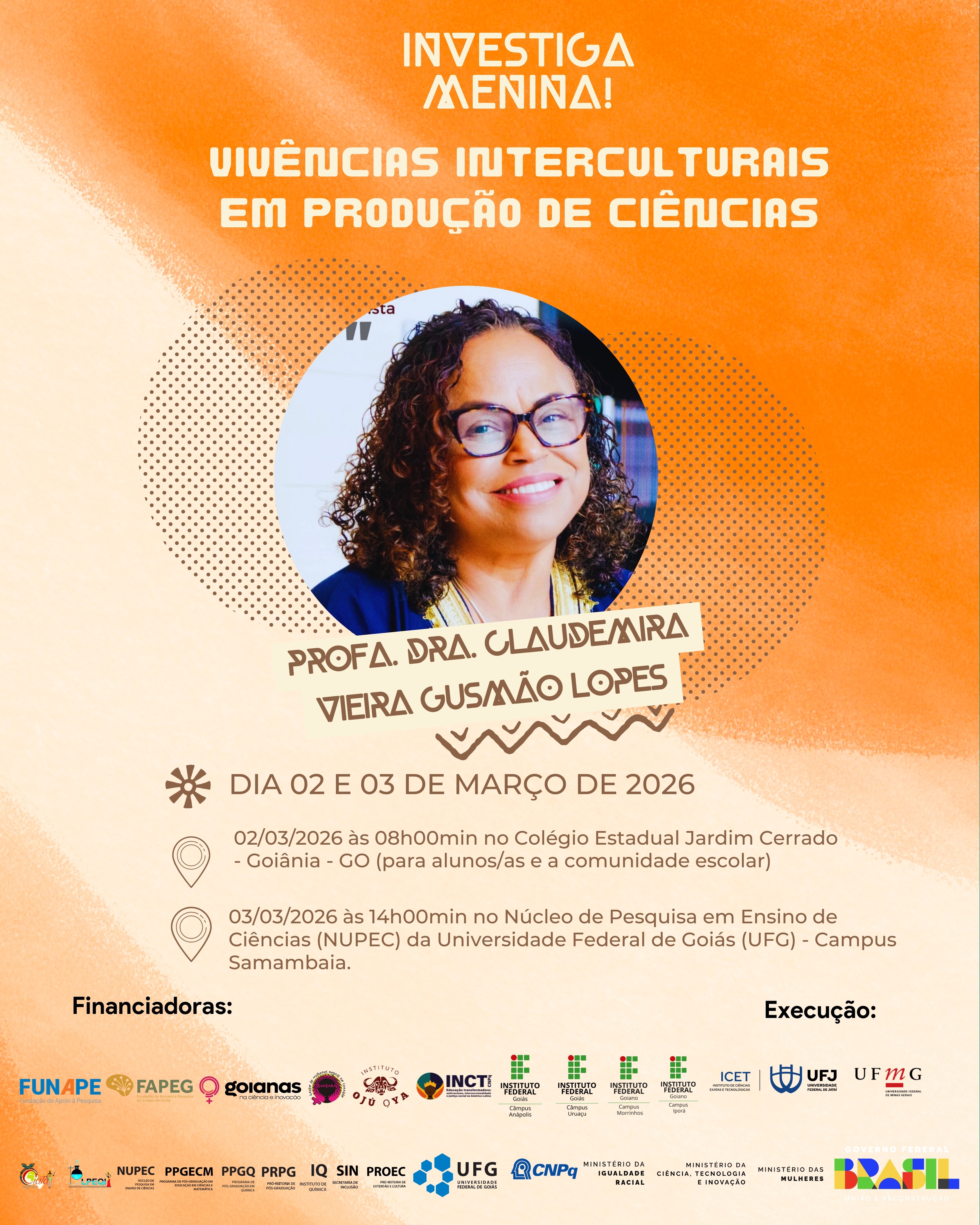👩🏽🔬Vem aí, a 1ª Vivência Intercultural em Produção de Ciências do Investiga Menina! de 2026, por meio da Chamada nº 31/2023 - Meninas nas Ciências Exatas, Engenharias e Computação do Conselho Nacional de Desenvolvimento Científico e Tecnológico - CNPq, o Ministério da Ciência, Tecnologia e Inovação - MCTI e o Ministério das Mulheres - MMulheres. A Chamada nº 44/2024 - Universal - Faixa B - Grupos Consolidados, do CNPq/MCTI. A Chamada nº 46/2024 – Programa Institutos Nacionais de Ciência e Tecnologia – INCT, por meio MCTI/CNPq/SECTICS/MS/CAPES/FAPs. Os editais “Programa de Auxílio à Pesquisa Científica e Tecnológica – Pró-Licenciaturas”, "Apoio a Projetos de Extensão de Instituições de Ensino Superior do Estado de Goiás" e "Mulheres em STEM", todos da Fundação de Amparo à Pesquisa do Estado de Goiás (FAPEG) e o edital de apoio a realização de eventos científicos da Fundação de Apoio à Pesquisa (FUNAPE) da Universidade Federal de Goiás (UFG).